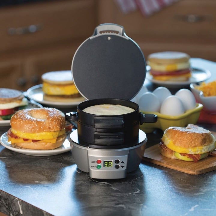 21. A breakfast sandwich maker that'll save you from buying your breakfast every morning. It'll cook all the ingredients in under five minutes, so you can enjoy a hot, homemade meal before you leave.