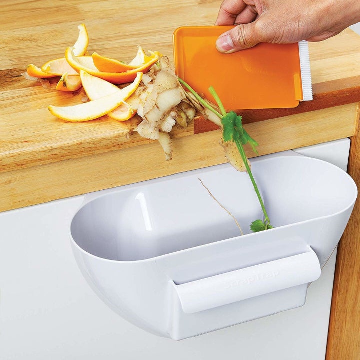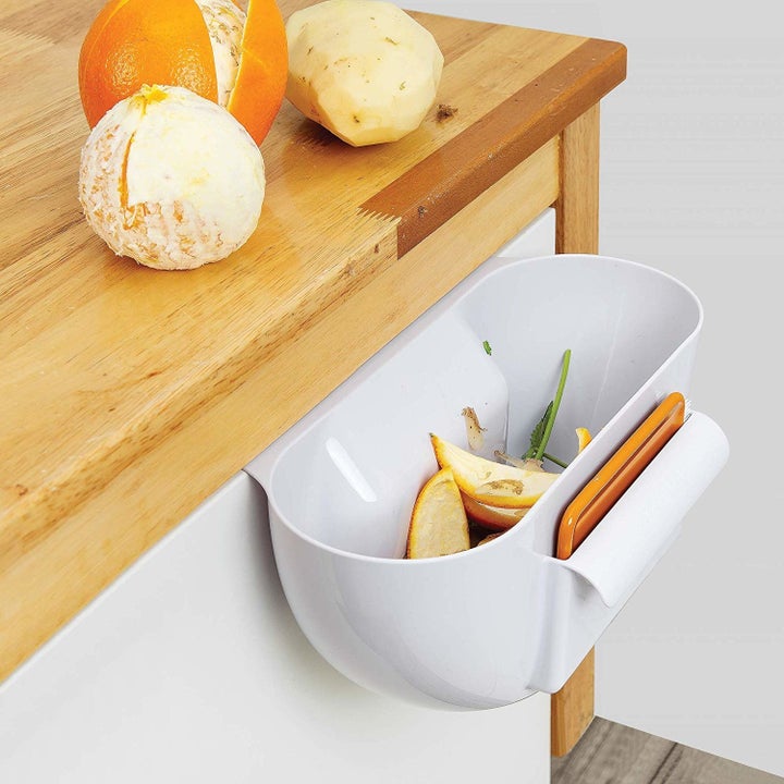 2. A small bowl that'll collect scraps while you're cutting or peeling foods. It'll hold up to eight cups of food waste and comes with a 2-in-1 brush and scraper that'll help you clean your countertops without damaging them or getting your hands dirty.