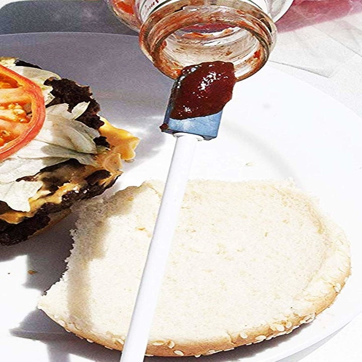 33. A tiny slotted spoon that'll help you get olives out the jar, without picking up any of the juice. It also comes with a stainless steel fork attachment that's designed to get pickles out of the jar, so you don't have to use your fingers.