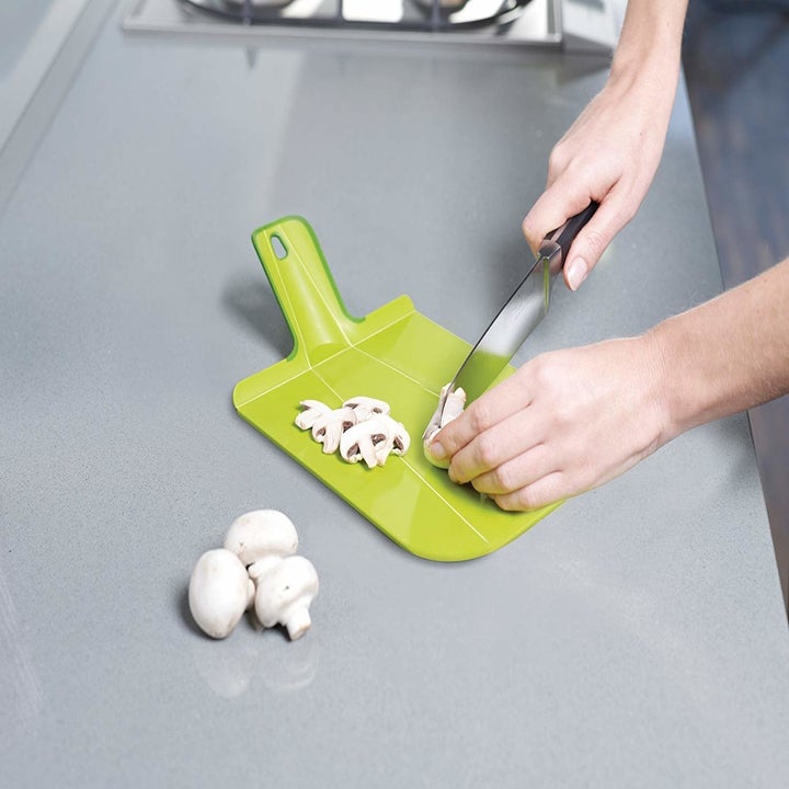 9. A foldable cutting board that'll help you transfer your chopped veggies and spices into the pan when you're cooking. It'll lay flat while you're cutting and transforms into a funnel when you grip the handle.