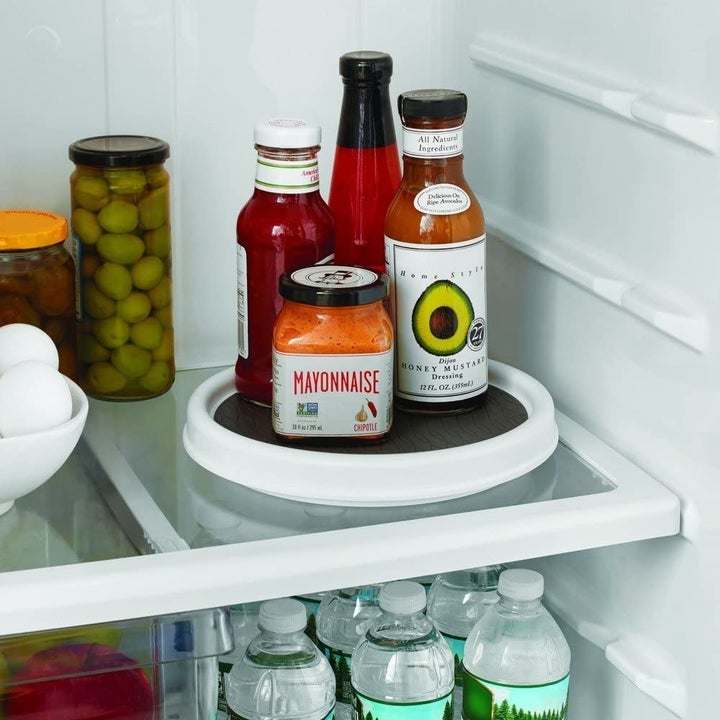 10. A cabinet tray that'll spin like a lazy Susan and save you from reaching to the back of your cupboard or fridge for your food items. And it has a non-slip surface, so your jars and bottles won't fall off when you're spinning it.